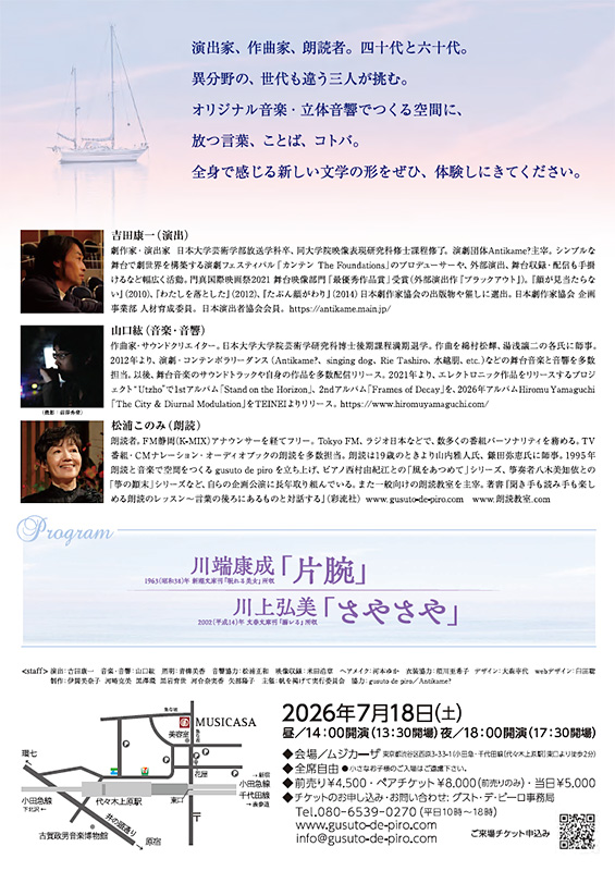 文学作品をオリジナル音楽・音響で味わっていただく、新しいシリーズ公演を立ち上げます。演出家・吉田康一さん、作曲家・サウンドクリエイター・山口紘さん 40代の二人のセンスに身を任せ、静かで濃密な世界を語ります。